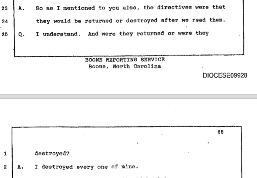 Deposition statement from Monsignor West describing the destruction of reports on the treatment of Damion Lynch, a former Charlotte priest.